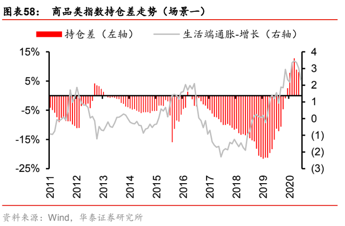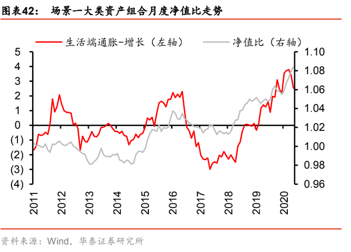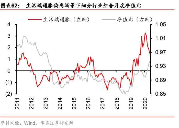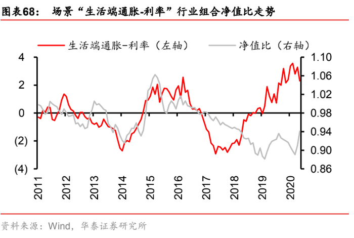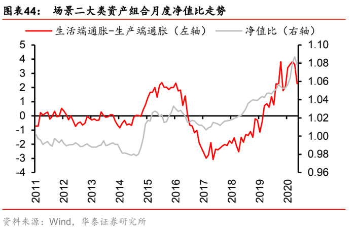 (2) 场景二:“生活端通胀-生产端通胀”,即生活端通胀因子的风险暴露偏离设定为+0.002,生产端通胀因子的风险暴露偏离设定为-0.002(相当于始终做多生活端通胀,做空生产端通胀)。该场景刻画了CPI和PPI“剪刀差”的宏观经济现象,其原因既包括权重商品(如猪肉、钢铁)价格在某一时期的持续上涨或下跌,也包括实体经济上下游的行业竞争环境不同,导致上下游价格传导不通畅。