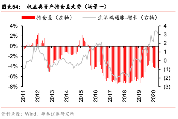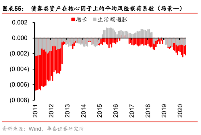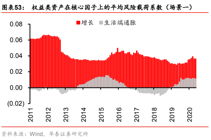 (1) 场景一:“生活端通胀-增长”,即生活端通胀因子的风险暴露偏离设定为+0.005,增长因子的风险暴露偏离设定为-0.002(相当于始终做多生活端通胀,做空增长)。该场景刻画了“滞胀”的宏观经济现象——当经济增长有失速风险时,政府通过增发货币来刺激经济,导致物价上行,通货膨胀,对于权益投资者而言,这是偏利空的宏观环境。