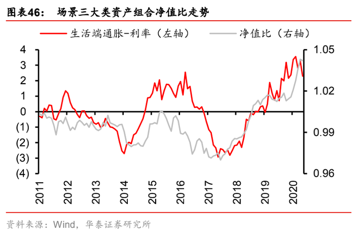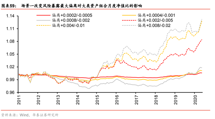(3) 场景三:“生活端通胀-利率”,即生活端通胀因子的风险暴露偏离设定为+0.002,利率因子的风险暴露偏离设定为-0.002(相当于始终做多生活端通胀,做空利率)。该场景对应的逻辑是:利率下行,储蓄回报率降低,消费需求上升,引起生活资料价格的上涨;反之同理。