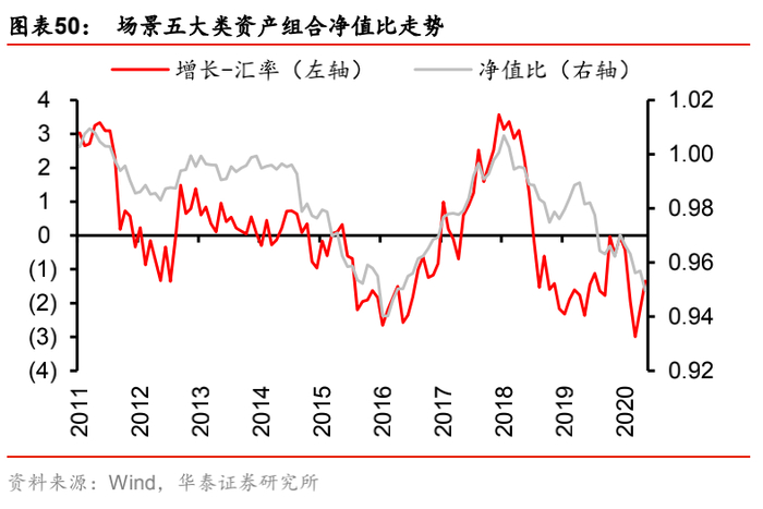 (5) 场景五:“增长-汇率”,即增长因子的风险暴露偏离设定为+0.005,汇率因子的风险暴露偏离设定为-0.002(相当于始终做多增长,做空汇率)。该场景对应的逻辑是:国内经济增速上行,市场整体投资回报率上升,对外资的吸引力增加,本币升值(美元对人民币中间价走低);反之同理。