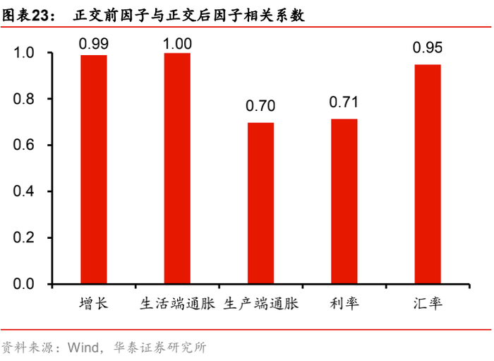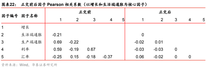 以增长和生活端通胀为核心因子举例说明,正交化之前增长、生产端通胀、利率三者之间高度正相关,这是因为经济扩张时往往伴随资产价格和均衡利率的上涨,三者之间呈现出同步变化的趋势;而正交化之后,核心因子内部、次要因子内部都严格正交,而次要因子与核心因子间的相关系数绝对值也都小于0.06,说明混合正交方案能够有效消除因子间的共线性;进一步,对比正交前后的因子走势,发现普遍非常接近,即使是信息丢失最多的生产端通胀因子,其正交前后因子相关系数也高达0.7。因此,本文最终采用了混合正交方案,既能消除因子共线性,又能尽可能多地保留因子原始信息。