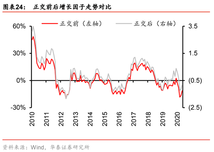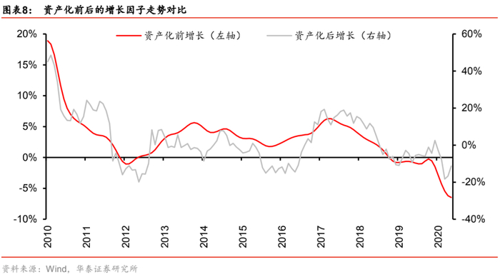 因子资产化的根本目的是希望通过构建资产组合来复制宏观因子的走势,因而资产化效果的好坏取决资产化后的宏观因子对资产化前的宏观因子的解释程度。由于资产化前的增长因子是同比口径,因此资产化后的组合净值也需要进行对数同比变换才能统一比较口径。结果表明,资产化后增长因子的走势能较好的还原资产化前增长因子的走势,拟合优度达到60%,而且增添了更多细节信息,对资产价格的短期变动或许有更好的解释能力。