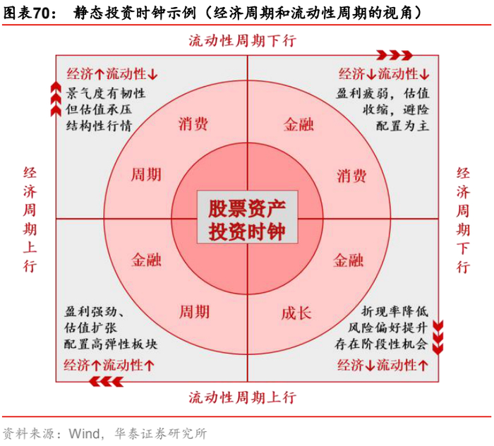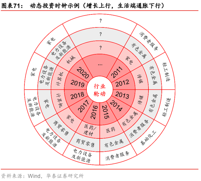 与大类资产相比,宏观因子对行业的解释力稍弱且相对不稳定,导致宏观风险配置模型在行业层面的表现欠佳,但它仍然为行业配置提供了一种新的思路:传统的行业投资时钟模型是通过历史统计得到各种宏观环境与行业表现相对强弱的静态、线性映射关系,但实际上宏观环境对行业的驱动逻辑是动态演变的,因为每个行业都有自身的生命发展周期,处于生命周期不同阶段的行业对宏观环境变动的敏感性不同,因此将静态观点用于动态配置存在可行性的问题,而基于宏观风险配置体系,可以及时捕捉宏观环境对各行业驱动逻辑的最新变化,进而构建动态视角下的投资时钟。