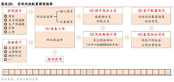 (1) 准备工作:针对每一个滚动区间,计算金融资产和宏观因子(资产化后)的月度收益率序列;根据对未来宏观环境变化的预判,确定一个或多个对未来金融资产价格变化可能产生主导影响的因子,即核心宏观因子。比如判断未来是滞涨环境(增长上行、通胀下行),那么增长和通胀就是核心因子;又比如判断未来汇率的变动可能主导资产价格变动,那么汇率就是核心因子;换言之,想要主动管理哪些宏观风险,这些宏观风险就是核心因子,其他因子则统称为次要因子。