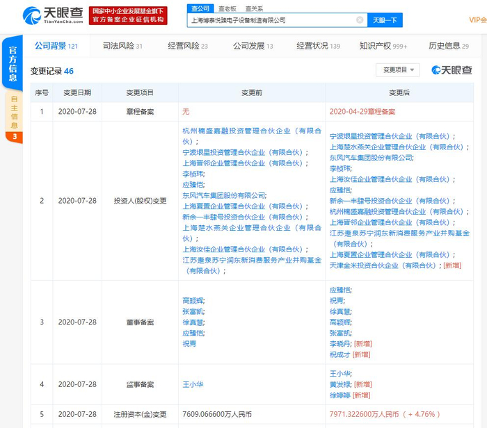 天眼查APP显示,近日,上海博泰悦臻电子设备制造有限公司发生工商变更,股东新增小米集团旗下的天津金米投资合伙企业(有限合伙),其注册资本也从约7690.07万人民币增至约7971.32万人民币,增幅为4.76%;此外,公司董事新增李晓丹、祝成才,监事新增黄发禄、徐婷婷。