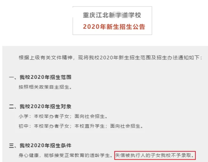 无独有偶,重庆江北某民办学校发出的招生公告中写到:失信被执行人的子女我校不予录取。