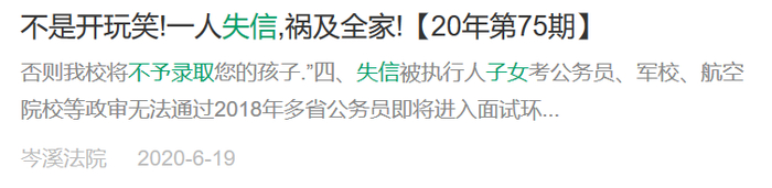 许多失信被执行人认为,限制消费措施仅针对其本人,不会影响到配偶、子女及其他家族成员。可子女不能报考“公务员”“事业单位人员”“军官学校”“教师”等等消息铺天盖地,上面高校拒录亦然。