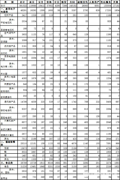 根据投诉性质(如图1所示)分类,在所有投诉问题中,售后服务投诉155,004件,占投诉总量的27.6%,合同投诉140,182件,占投诉总量的25.0%,质量投诉119,068件,占比21.2%,价格投诉57,952件,占比10.3%,虚假宣传投诉26,065件,占比4.6%,安全投诉18,412件,占比3.3%,假冒投诉7,266件,占比1.3%,人格尊严投诉6,001件,占比1.1%,计量投诉4,390件,占比0.8%,其他投诉27,182件,占比4.8%。售后服务问题、合同问题和产品质量问题仍是引发投诉的主要原因,占投诉总量的70%以上。