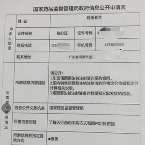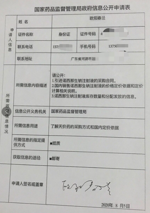 该份申请书显示,欧阳春兰请求公开引进诺西那生钠注射液的采购合同、国内销售价格定价依据和定价计算相关说明,以及诺西那生钠注射液库存数量和分配发放的信息。