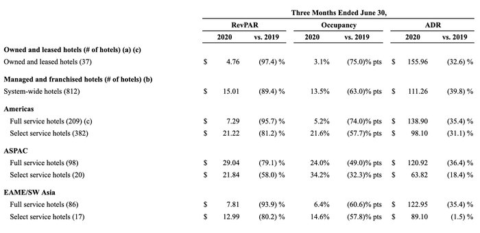 数据显示,凯悦酒店二季度的全系统RevPAR(每间可供入住客房收益)和去年同期相比下降了89.4%。不过,凯悦酒店指出,部分酒店已经在二季度后期开始恢复运营。截至6月30日,系统内80%的酒店已经恢复运营。截至7月31日,系统内87%的酒店恢复了运营。