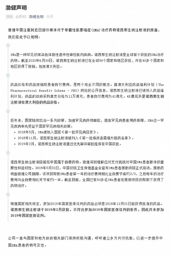 8月4日,渤健生物发布声明,对此前报道进行了解释说明,称,截至2020年6月30日,诺西那生钠注射液已在全球50个国家和地区获批,并在40多个国家和地区获得了报销,包括澳大利亚。