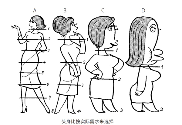 B是四头身,脸部要比八头身的大许多,就算放远看,面孔也比较清晰。到了C,脸就更加突出了。D则是二头身,如果现实里有这样的女人,那肯定是妖怪无疑,但一旦拉开距离,看起来也没有那么不自然,而且五官与表情都十分鲜明。