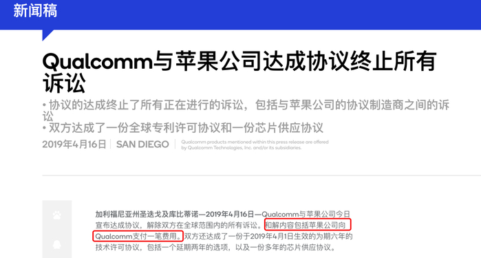 2019年4月,苹果高通专利案和解,苹果需支付高通一笔专利费,图源:高通官网