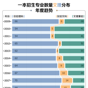 除了一直以来维持在高位的文理专业占比差距,另一个情况也值得注意:文理兼招的专业比例总体而言呈现持续下降的趋势,而仅招理科或仅招文科的专业数量占比有上升的趋势。