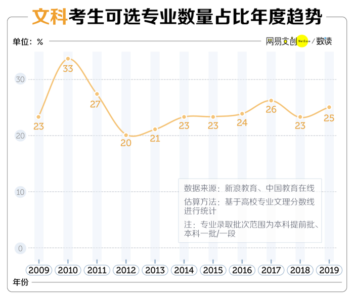 以可招收文科生的专业数量(含仅招文科和文理兼招)除以所有专业数量,计算文科生可选专业数量占比这一指标,可以发现在过去 11 年里,除了 2010 年,这一比例在大多数时候围绕 24% 的平均值附近小幅度波动。