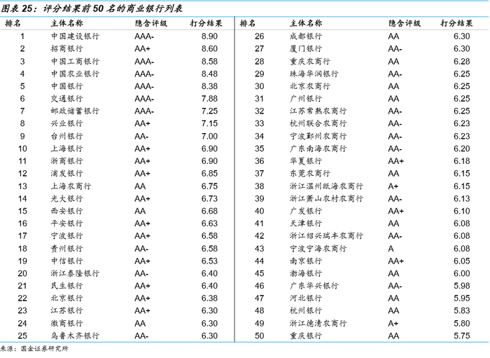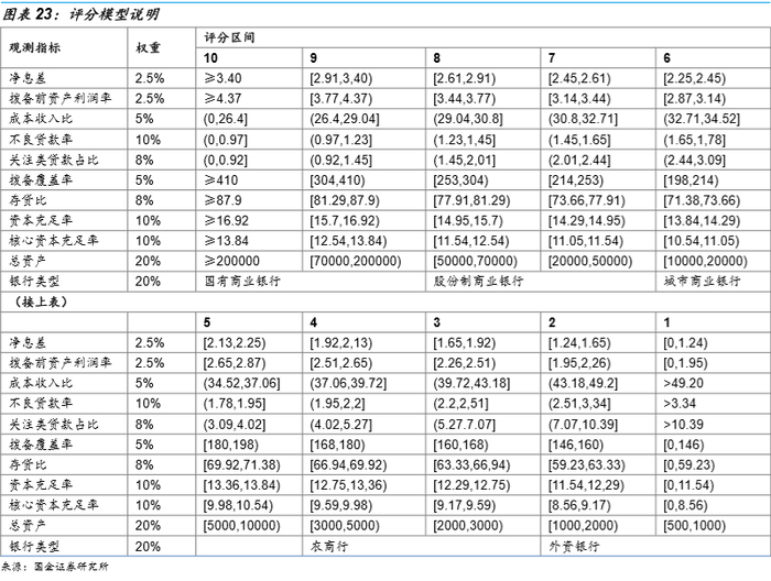 打分规则是从优至劣赋值10-1分,各指标评分区间的划分是参考样本总体的数值分布确定,根据分位情况将数据序列划分为10段。定量指标中成本收入比、不良贷款率和关注类贷款占比是反向指标,因此数值越小则赋值越大;其余定量指标与主体资质正向相关,指标数值与赋值呈正比。定性指标方面,国有大行、股份制行、城商行、农商行和外资银行分别赋值10、8、6、4和2分。