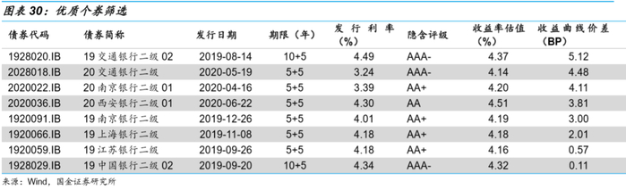 基于以上分析,我们进一步筛选出资质较好且收益较高的优质个券供投资者参考,择券标准是隐含债项评级在AA级以上(包括AA级),发行主体的资质评分排名在前50名,且中债收益率估值高于平均水平。经筛选有8只存量个券符合标准,发行主体均为中大型银行,期限包括10年期和15年期,都是距今1年以内发行的新券。其中,交通银行发行的两只二级资本债与其所属的收益曲线价差较高,具有一定的性价比。