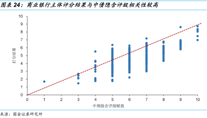为验证模型有效性,将样本评分结果与所发行次级债的隐含评级赋值相比较,两者相关系数为73.54%,表明评分具备一定的有效性。