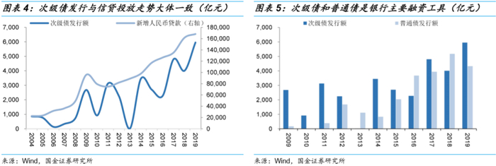 商业银行金融债主要包括普通债、次级债和混合资本债,近年来次级债发行规模呈震荡上行趋势,2019年发行金额和只数分别为5955亿元和72只,总规模创下历史新高。由于次级债可缓解中小银行的资本充足压力进而增强其信贷投放能力,因此从历史上看次级债发行与新增人民币贷款走势大体一致。2013年全年只发行2只次级债、总计融资17亿元,原因在于《办法》实施后旧次级债向新二级资本债过渡,导致发行量骤降。