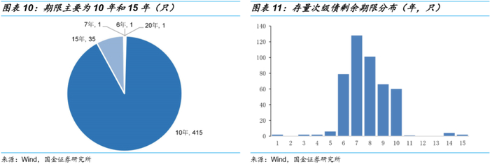 存量次级债的期限绝大多数为10年和15年,主要形式为5+5和10+5,即发行人有权在到期的最后5年以前行使赎回权,设置原因在于二级资本债在距到期日前最后五年计入二级资本的金额按每年20%的比例逐年递减。出于补充资本金的目的,大多数时候银行会选择在赎回行权日提前赎回次级债,使得存量次级债平均剩余期限较长为7.25年,其中仅有12只剩余期限小于5年。