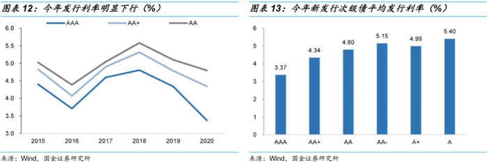 由于年初疫情引发经济下滑,逆周期的宽松性货币政策密集出台,带动商业银行次级债发行利率较去年明显下行。今年新发行债项评级为AAA级、AA+级和AA级的次级债平均发行利率分别为3.37%、4.34%和4.8%,分别较去年回落96.87、44.6和30.43个BP,其中AAA级下行尤为显著。