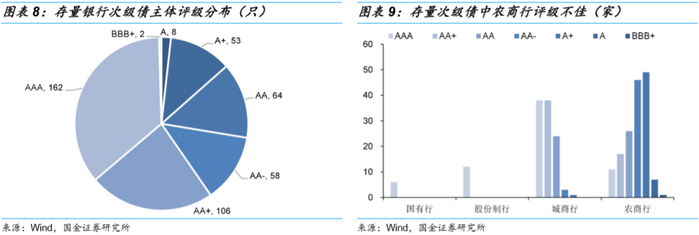 从最新主体评级来看,存量银行次级债中高评级的发行主体占大多数,AAA和AA+主体对应的债券只数占比分别为35.76%和23.4%,金额占比则为90.91%和5.47%;低评级债券只数相对较少,最低主体评级到BBB+,可见评级分布跨度较大,说明银行资质较分化。分类型来看,高评级主要来自国有行、股份制行和城商行,其中国有行和股份制行均为AAA评级;低评级主要来自农商行,农商行主体评级大多分布于AA-和A+。