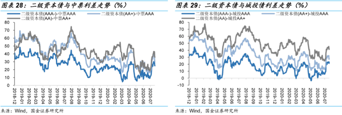 伴随5月以来经济确定性回暖后资金面边际收紧,二级资本债收益率快速上行并超过疫情发生以前。当前AAA-级、AA+级和AA级收益率水平处在历史中位附近,低评级达到历史高位,均显著高于10年国债收益所处分位数,说明信用利差较高。相对价值方面,7月以来二级资本债与中期票据、城投债的利差快速走阔,较高评级的资本债收益率有20-40BP的溢价,在当前“票息为王”的信用债主线策略下,具备良好的投资性价比。