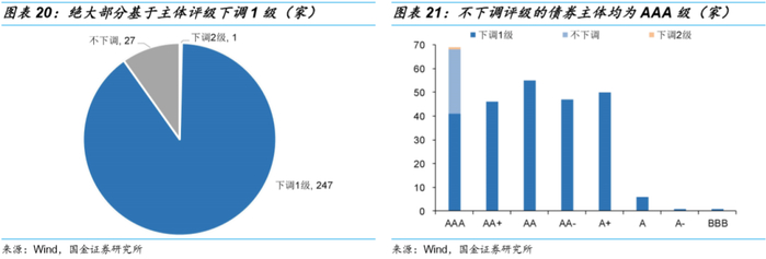 存量银行次级债的债项评级主要在主体评级的基础上下调0-1级,存量债涉及的275家商业银行中有247家下调1级,27家没有下调,分别占整体的89.82%和9.82%;其中1家下调2级,主体和债项分别为AAA级和AA级,为去年发生过风险事件的包商银行。