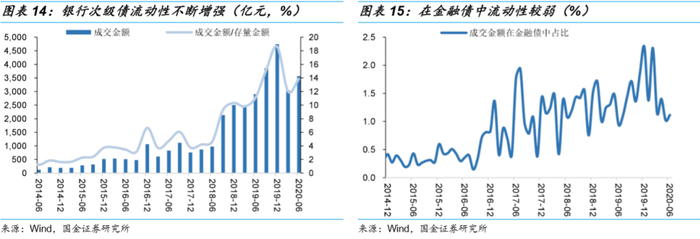 现阶段银行次级债的月成交金额在1000亿元左右,以成交金额与债券余额的比值计算换手率,月度换手率在5%左右。伴随市场发展持续深化,银行次级债流动性在不断增强。但与其他金融债相比,银行次级债流动性依然较差,成交金额在整体金融债中的占比长期处于1-2%之间,一方面源于其市场规模较小,另一方面次级债属于长久期债券,对资金端期限要求较高,主要由理财和保险等机构以获取票息的目的配置持有,因此活跃度较差。