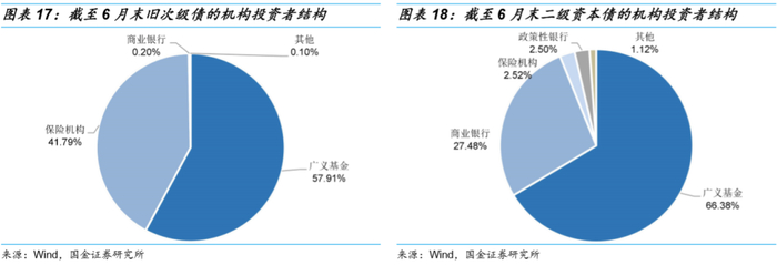 旧次级债和二级资本债的机构投资者结构差异较大,旧次级债主要由广义基金和保险公司持有,截至2020年6月末持有比例分别为57.91%和41.79%;二级资本债的机构投资者覆盖范围更广,广义基金、商业银行和保险机构持有占比分别为66.38%、27.48%和2.52%,广义基金中的银行理财占比26.99%。