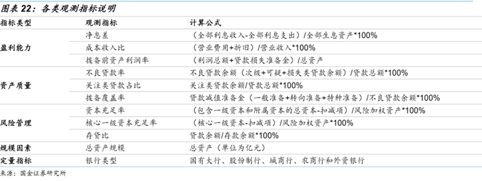 上述观测指标均为定量指标,定性指标我们选取银行类型,即把银行划分为国有大行、股份制行、城商行、农商行和外资银行。区域性的城商行和农商行运营范围有限,受当地经济发达程度、财政实力和产业结构等基本面因素影响显著,与全国性的国有行和股份制行经营差异较大;而外资银行表现水土不服,业务限制尚未完全取消,与内资银行相比竞争力较弱。