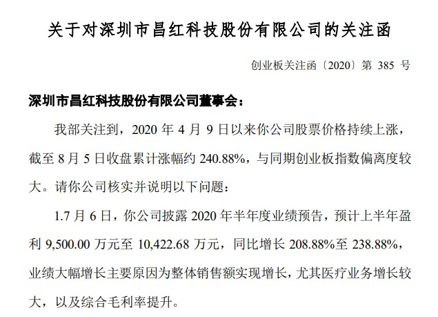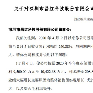 关注函中指出,2020年4月9日以来昌红科技股票价格持续上涨,截至 8 月 5 日收盘累计涨幅约 240.88%,与同期创业板指数偏离度较大。