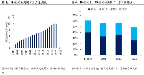 1800至1820年,通过应用动力机械设备,英国的工业产量增长了50%,而农业经济比重被压缩至1/3以下(见图3、4)。但尽管供给能力大幅增长,却因为战争的结束,导致以往可以制作成军服的英国棉布在欧洲大陆的需求下降,商品贸易活动遇冷,英国股市陷入了一段时间的低迷期。1814-1816年,英国股市回调了大约20%。