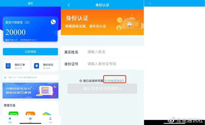 点击立即借款后,进入下图身份认证界面,WEMONEY研究室注意到,确实有《VIP会员协议》,点击后出现图三空白页面,经过苹果和安卓多部手机测试均为空白页。