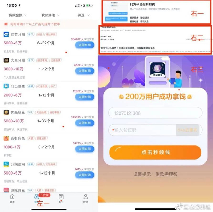 如上图左一所示,乐花分期贷超有二十余种借款APP,大部分为“问题APP”。这些APP大致可分为三类,第一类如上图所示的714、55高炮等非法平台;第二类如芒芒分期这样收割用户会员费;第三类则如俄罗斯套娃,不断下载APP却无法借钱,以收集用户手机号及信息为主。