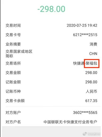 但李女士和其他用户展示的扣款截图里,显示为快捷通-聚福包。一位支付公司高管表示,一般前者代表第三方支付公司,后者为商户名称,也就是说代扣款的商户为聚福包。