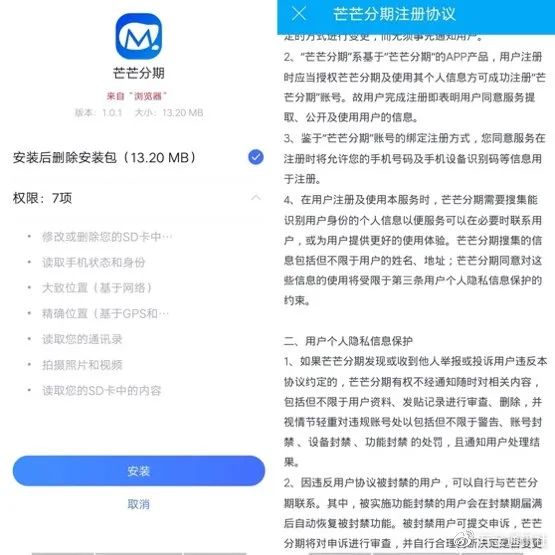 这表明,用户根本看不到协议内容,一旦填写身份信息和银行卡,输入短信验证码,也就等于给芒芒分期一个特权,可以从用户银行卡代扣款。