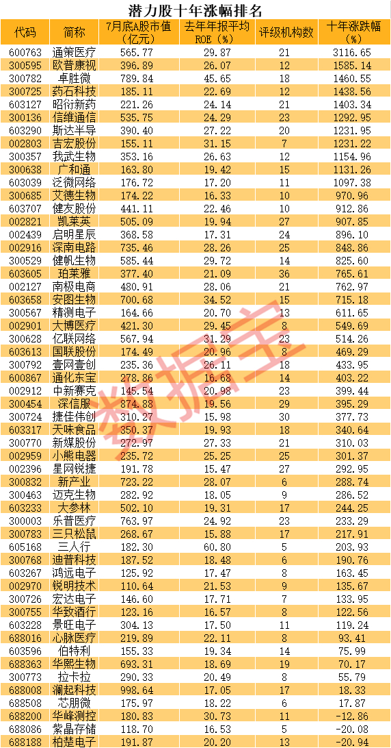统计显示,截至7月底,沪深两市A股合计有71只个股十年来涨幅超过10倍。其中,疫苗龙头康泰生物涨幅高达7060.7%位居首位。涨幅第二位的是科技龙头立讯精密,十年涨幅超48倍。涨幅第三位是消费类龙头牧原股份,十年涨幅超33倍。
