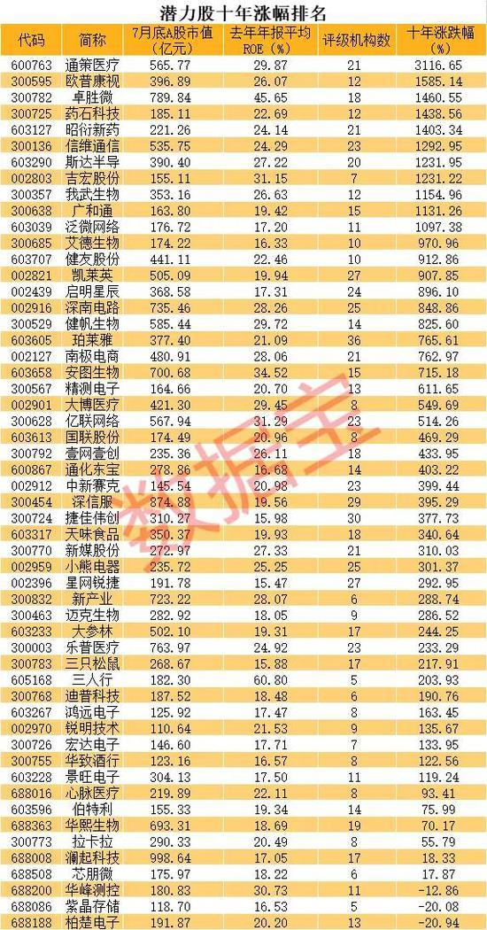 数据宝统计显示,截至7月底,沪深两市A股合计有71只个股十年来涨幅超过10倍。其中,疫苗龙头康泰生物涨幅高达7060.7%位居首位。涨幅第二位的是科技龙头立讯精密,十年涨幅超48倍。涨幅第三位是消费类龙头牧原股份,十年涨幅超33倍。