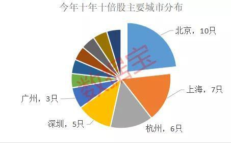 值得一提的是,A股市场十年十倍股还具有较强的地域属性。北上广深杭五个城市贡献了较多的长线牛股,合计有31只股票,占比近44%。其中,北京贡献10只大牛股,上海7只,杭州6只,深圳5只,广州3只。