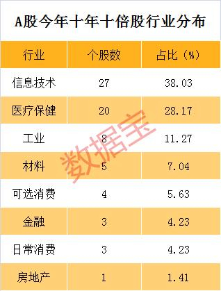 医疗保健、可选消费、日常消费等行业,隶属于大消费板块,信息技术属于科技股。也就是说,今年消费科技股中合计有54只十年十倍股,占比超76%。