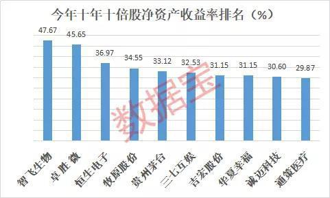 盈利能力方面,今年71只十年十倍股,去年年报平均净资产收益率中位数接近20%,A股市场整体去年净资产收益率中位数为7.5%左右。其中,智飞生物、卓胜微、恒生电子等9只股票净资产收益率超过30%。