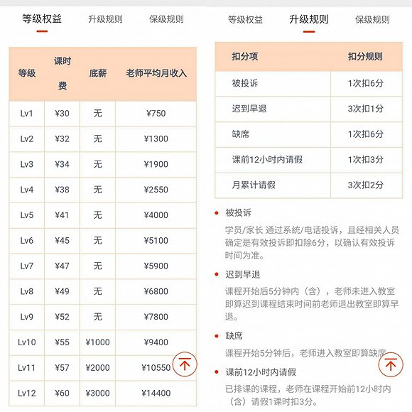 据小芸介绍,这套“打怪升级”的攻略分为12个等级,最低一级为LV1,课时费30/小时,老师月平均收入为750元。只有等级达到LV10及以上,才会发放底薪。达到最高的LV12级后,老师的课时费为60/小时,加上3000元底薪,老师月平均收入约为14400元,以30天计算,平均每天授课六个多小时。