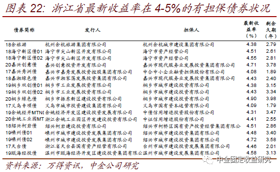 在收益率4-5%的有担保城投债券中(如图表22),发行人主要由所在设区市或所在区县平台进行担保增信,与收益率在5%以上的有担保债券主要由专业担保公司进行增信具有不同特征,其中浙江省天台县国有资产经营有限公司、瓯海经开、嵊州城投所在区域财力较弱但均由市级国资进行担保,余姚经开、浙江余姚工业园区开发建设投资有限公司则分别由中债信增、中证信增进行担保。考虑担保人信用资质较强、债项风险可控,建议对于估值波动不敏感的投资者可以积极配置获取溢价。