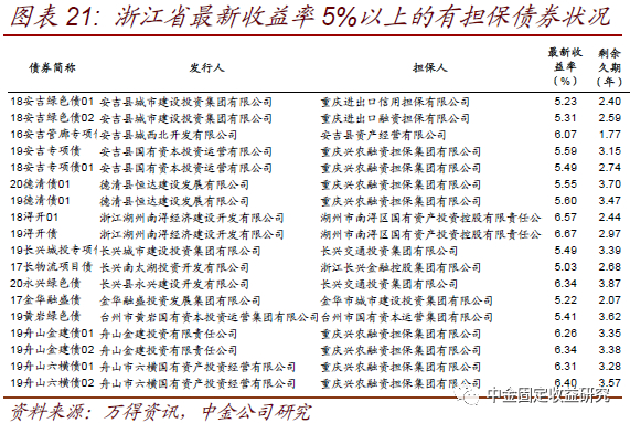 在收益率超过5%的有担保城投债券中(如图表21),舟山金建、六横国资业务范围及自身净资产规模很小,本应规避;但在附加担保后增信幅度相对较大,而两家发行人债券的最新收益率均在6%以上,具有较好的保护空间。