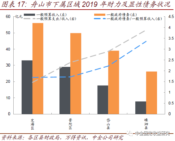 2019年舟山市各区县的一般预算收入规模普遍不大,其中市辖区强于市辖县;财政平衡性方面,除定海区的平衡较好外其他区域均不佳,其中嵊泗县平衡状况最弱。从财力规模的角度来看,2019年定海区、普陀区的一般预算收入分别为33.1亿元、29.0亿元,同期岱山县、嵊泗县分别为17.6亿元、7.8亿元,整体看舟山市各区县的财力均不强。财政平衡性方面,2019年定海区一般预算支出/一般预算收入的比例为1.5,平衡状况较好;而普陀区、岱山县、嵊泗县该比值分别为2.4、2.9、3.9,财政平衡性不佳,其中嵊泗县平衡状况最弱。
