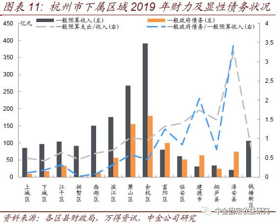 截至2019年末余杭区、萧山区一般债务规模较大,但得益于财力较强显性债务率并不算高;郊区的淳安县、建德市、富阳区显性债务率超过100%,其中淳安县、建德市分别高达350.65%、204.2%,债务负担很重;六大城区债务规模较小而财力尚可,显性债务负担轻。从显性债务的角度来看,截至2019年末余杭区、萧山区的一般政府债务余额分别为179.3亿元、154.6亿元,为杭州市仅有的一般债务余额超过100亿元的区域;富阳区、淳安县、建德市、滨江区、临安区一般债务规模在50-100亿元区间,其中富阳区以99.6亿元排名首位,临安区51.3亿元居末;而其他区域的一般债务规模均在35亿元以下(钱塘新区未查询到政府债务信息),其中拱墅区仅1.5亿元,显性债务规模很小。显性债务率方面,截至2019年末位于郊区的淳安县、建德市、富阳区分别以350.6%、204.2%、124.6%位居前三,是杭州市仅有的显性债务率超过100%的区域,淳安县、建德市债务负担很重;同样位于郊区的临安区、桐庐县分别以83.9%、71.3%的显性债务率紧随其后,而萧山区、余杭区虽然债务规模较大但财力也较强,显性债务率分别为57.8%、45.8%;六大城区由于债务规模较小而财力尚可,显性债务率均低于35%,债务负担轻。