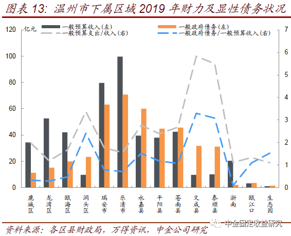 2019年温州市各行政区及功能区的一般预算收入规模均在100亿元以下,其中乐清市、瑞安市财力规模相对较大,三大功能区及泰顺县、洞头区、文成县财力弱;财政平衡性方面温州各区域的一般预算支出均大于收入,其中三大功能区及龙湾区平衡状况相对较好,五个市辖县及洞头区平衡状况不佳,其中泰顺县、文成县的一般预算支出/一般预算收入均超过5,平衡状况最弱。从财力规模的角度来看,2019年乐清市、瑞安市分别以99.7亿元、79.6亿元的一般预算收入排名温州市前两位,龙湾区、苍南县、瓯海区、永嘉县、平阳县、鹿城区同期的一般预算收入均在35-55亿元区间,此后浙南产业集聚区、泰顺县的财力分别为20.4亿元、10.1亿元,而洞头区、文成县、瓯江口产业集聚区、温州生态园均在10亿元以下,其中温州生态园仅1亿元。财政平衡性方面,2019年生态园、浙南、瓯江口三大功能区及龙湾区一般预算支出/一般预算收入的比值在1.1-1.4区间,平衡状况较好;同期乐清市、瓯海区、瑞安市、鹿城区该比值在1.5-2.0之间,平衡状况尚可;其余五个市辖县及洞头区该比值均在2以上,其中平阳县最低为2.39,泰顺县、文成县分别达5.50、5.83,平衡状况最弱。