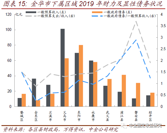 (5)金华市:位于浙江省中部,2019年一般预算收入列全省第7位,同期末显隐性债务率分列第6、11位,隐性债务负担较轻。市级平台2家,其中金华城投主要负责城区的土地整理及基础设施委托代建,业务范围有限、自身规模较小且债务负担较重;子公司金华城建主业区域垄断性不强,但债务负担可控。下属区域中义乌市财力较强,市辖区及县级市平衡状况较好;磐安县、浦江县显性债务负担较重,金东区显性债务率较低。非市级平台4家,其中义乌城投自身规模较小、债务负担很重,金汇五金核心业务公益性相对较弱且自身规模较小。