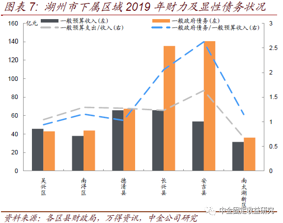 湖州市有存量公募债券的非市级平台17家,各行政区及南太湖新区均有发行人,其中吴兴区平台东部新城、德清县平台德清联创业务范围有限且不直属于相应级别国资管理部门,南浔区主体南浔经开所在区域财力增长且平衡性较好。对外担保方面,吴兴南太湖、安吉国资的或有负债风险较高。除上述3家市级平台外,湖州市目前共有17家有存续公募债券的城投发行人,分布在湖州2区3县所有行政区域以及南太湖新区:其中吴兴区两家平台湖州东部新城投资发展集团有限公司(“东部新城”)、湖州吴兴南太湖建设投资有限公司(“吴兴南太湖”)均非传统意义上的区域主要平台,分别为吴兴区织里镇、东部新区的基建主体,业务范围有限且均不直属于区级国资管理部门;南浔区、德清县存续公募债发行人均非主要平台,其中浙江湖州南浔经济建设开发有限公司(“南浔经开”)为南浔经开区的土地开发及基建主体,2019年南浔经开区实现一般预算收入20亿元(同比增长37.6%)、一般预算支出18亿元(同比增长31.2%),区域财力增长且平衡性较好,德清县建设投资有限公司、德清县恒达建设发展有限公司、德清联创科技新城建设有限公司(“德清联创”)分别从事德清县城西片区、德清县城区、德清县莫干山高新区(原德清经开区)地信小镇的土地整理、基础设施建设等业务,后者业务范围有限且债务负担较重;长兴县共有6家平台,为湖州各区域最多,其中主要平台长兴城市建设投资集团有限公司、长兴交通投资集团有限公司信用资质相对较好;安吉县、南太湖新区存续平台信用资质偏弱。对外担保方面,吴兴南太湖、安吉县国有资本投资运营有限公司(“安吉国资”)最新披露的对外担保比例均超过100%,被担保方均为区域内的国企,或有负债风险较高;德清联创对上市民企浙江三星新材股份有限公司2019年5月发行的1.92亿元三星转债提供全额无条件连带责任担保(该笔对外担保设有反担保措施,即质押的1000万股三星新材有限售条件股份)。